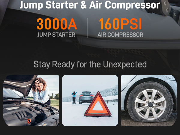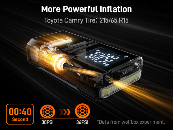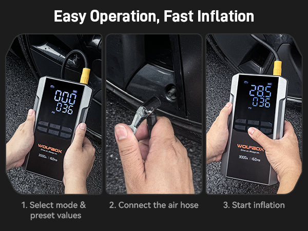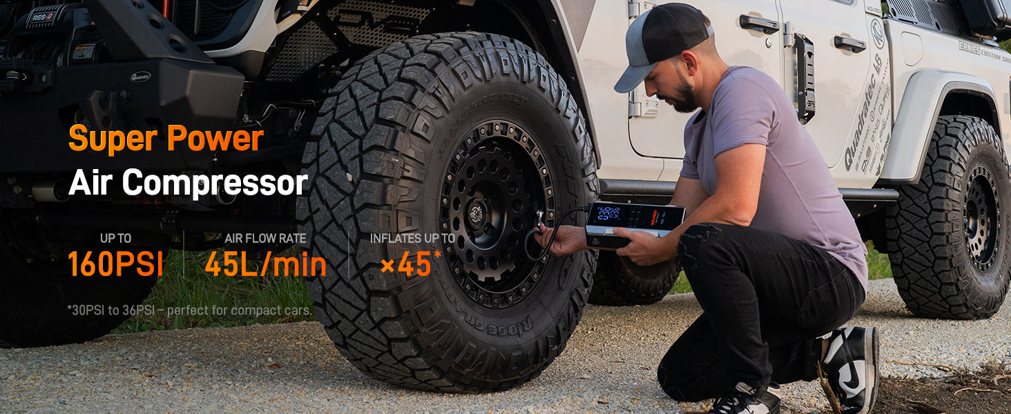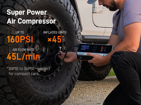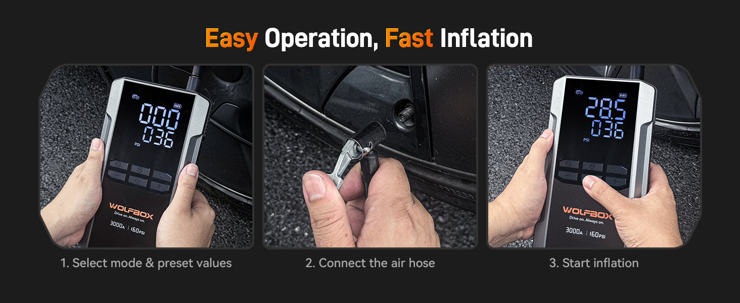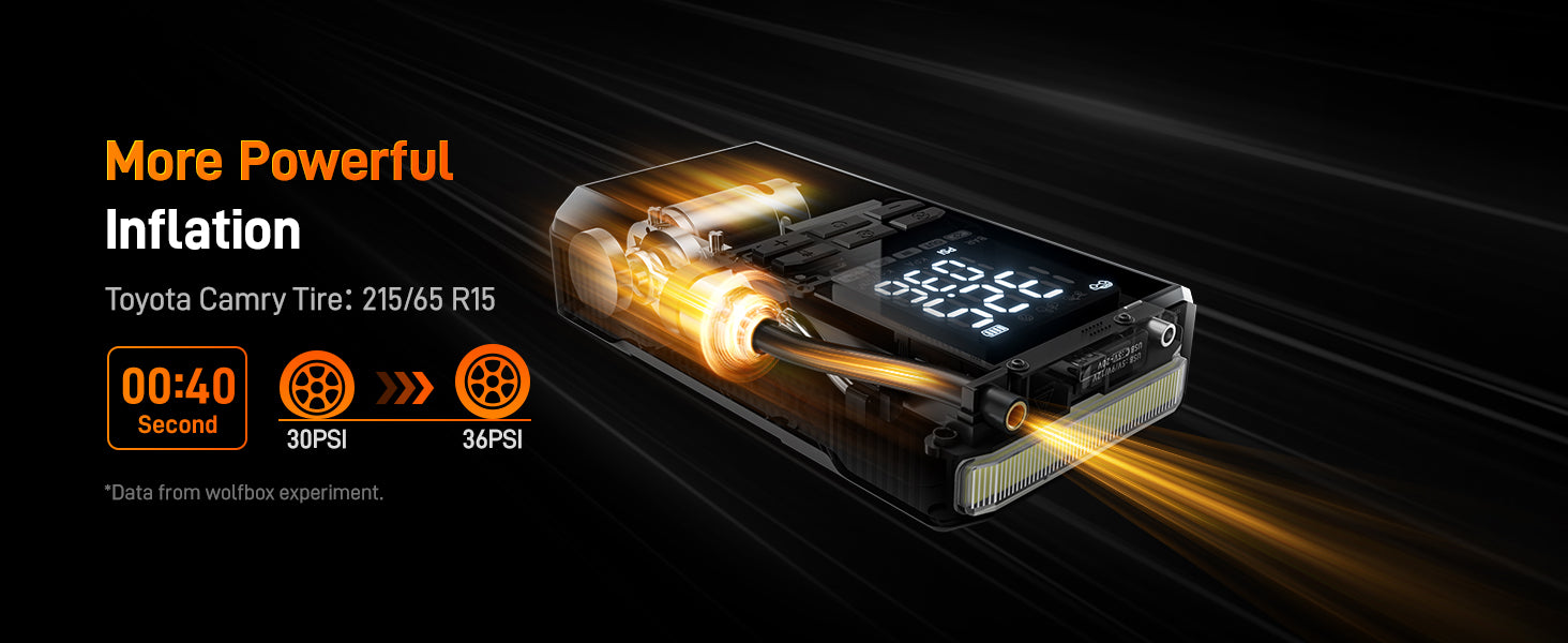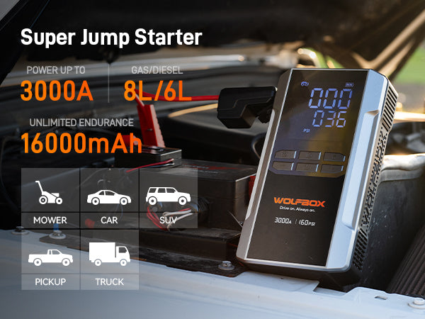 The Wolfbox MegaVolt16 Air is your ultimate on-the-go solution. It combines a 3000A jump starter and 160 PSI air compressor in one portable device. Powered by a 16,000mAh battery, it inflates up to 45 tires per charge and supports 12V vehicles. It also features a 400 Lumen LED flashlight, USB-C fast charging, and doubles as a power bank. Whether you're inflating tires, or charging devices, this all-in-one powerhouse has you covered.