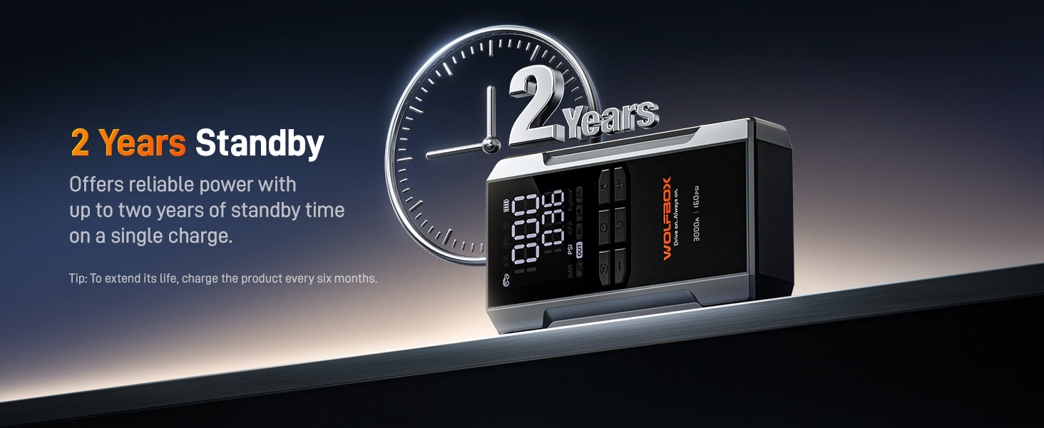 WOLFBOX MegaVolt16 Air Two-in-One Jumper Starter & Air Compressor can be stored between -4℉ ~140℉, allowing you to leave it in your car during both summer and winter without any issues.