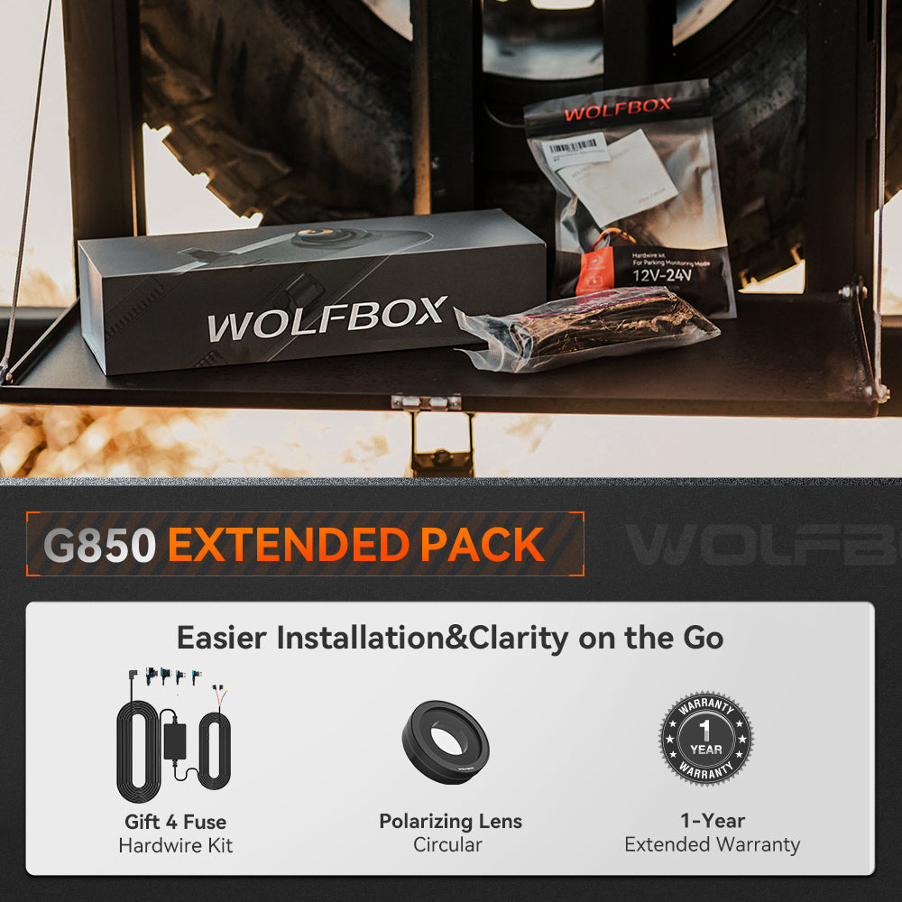 G850 Pro Package includes G850, Gift 4 Fuse Hardwire Kit (for easier installation, parking monitoring), Circular Polarizing Lens (for better vision), and an Extra 1-Year Warranty (for peace of mind).