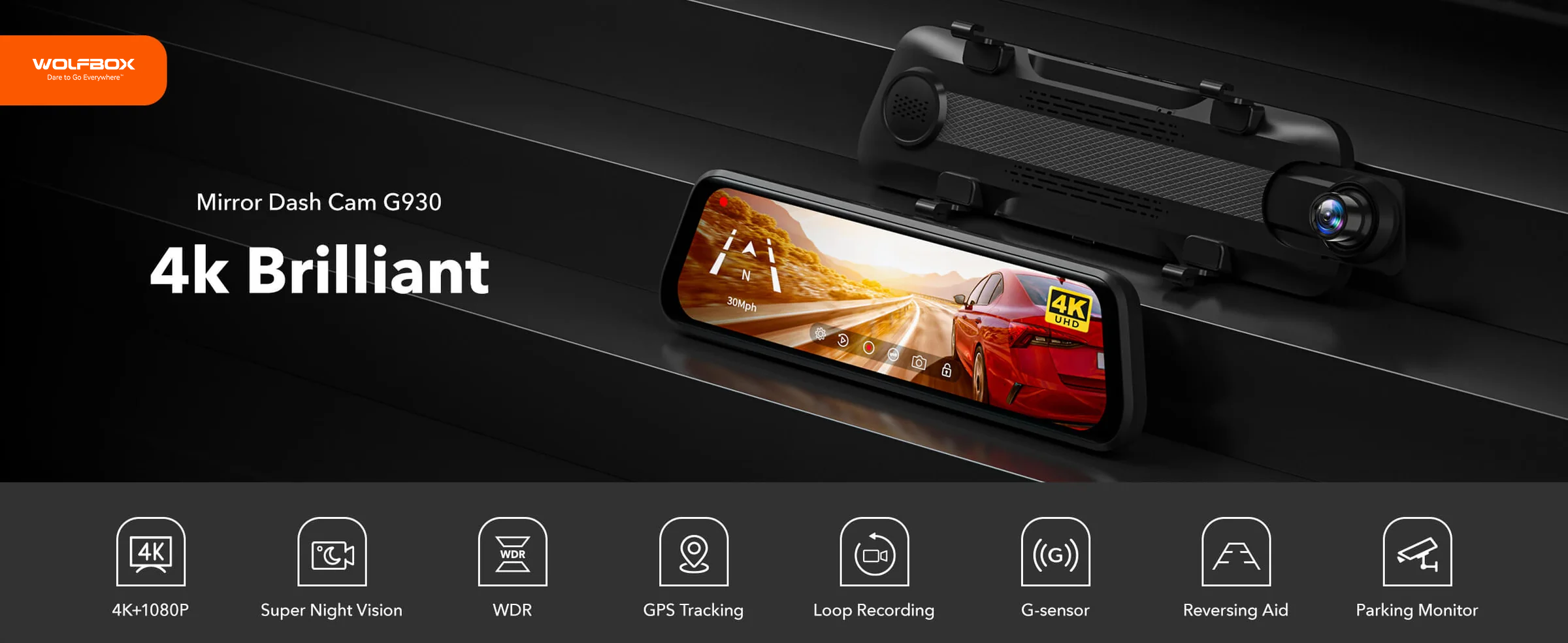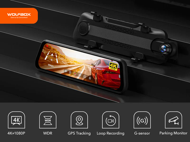 WOLFBOX G930 rear view mirror camera is a cutting-edge 4K dash cam equipped with a reliable mirror design.