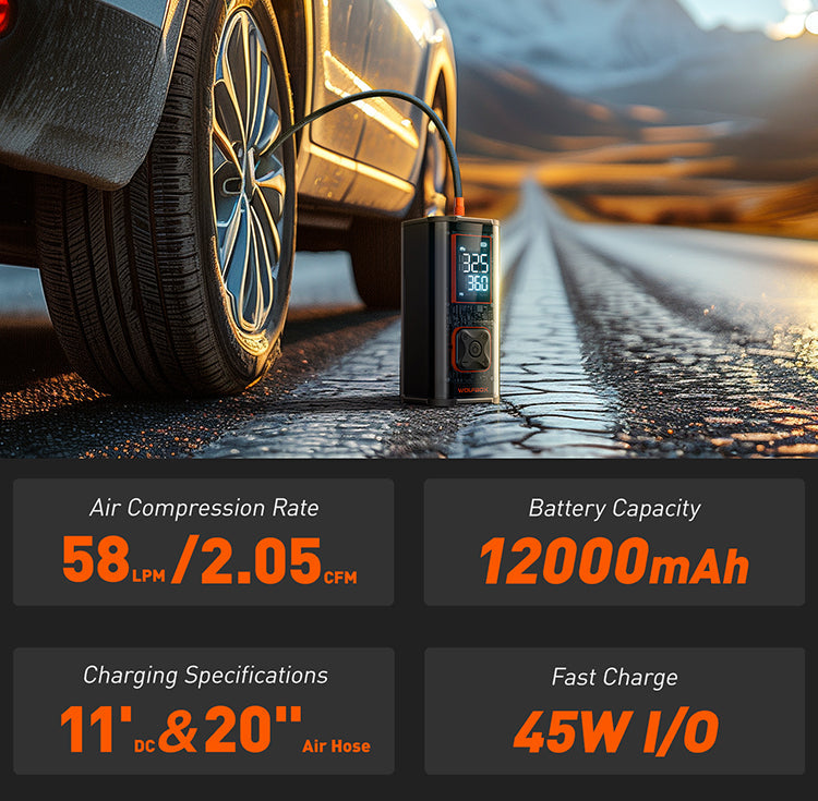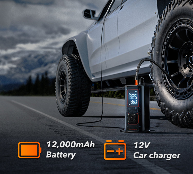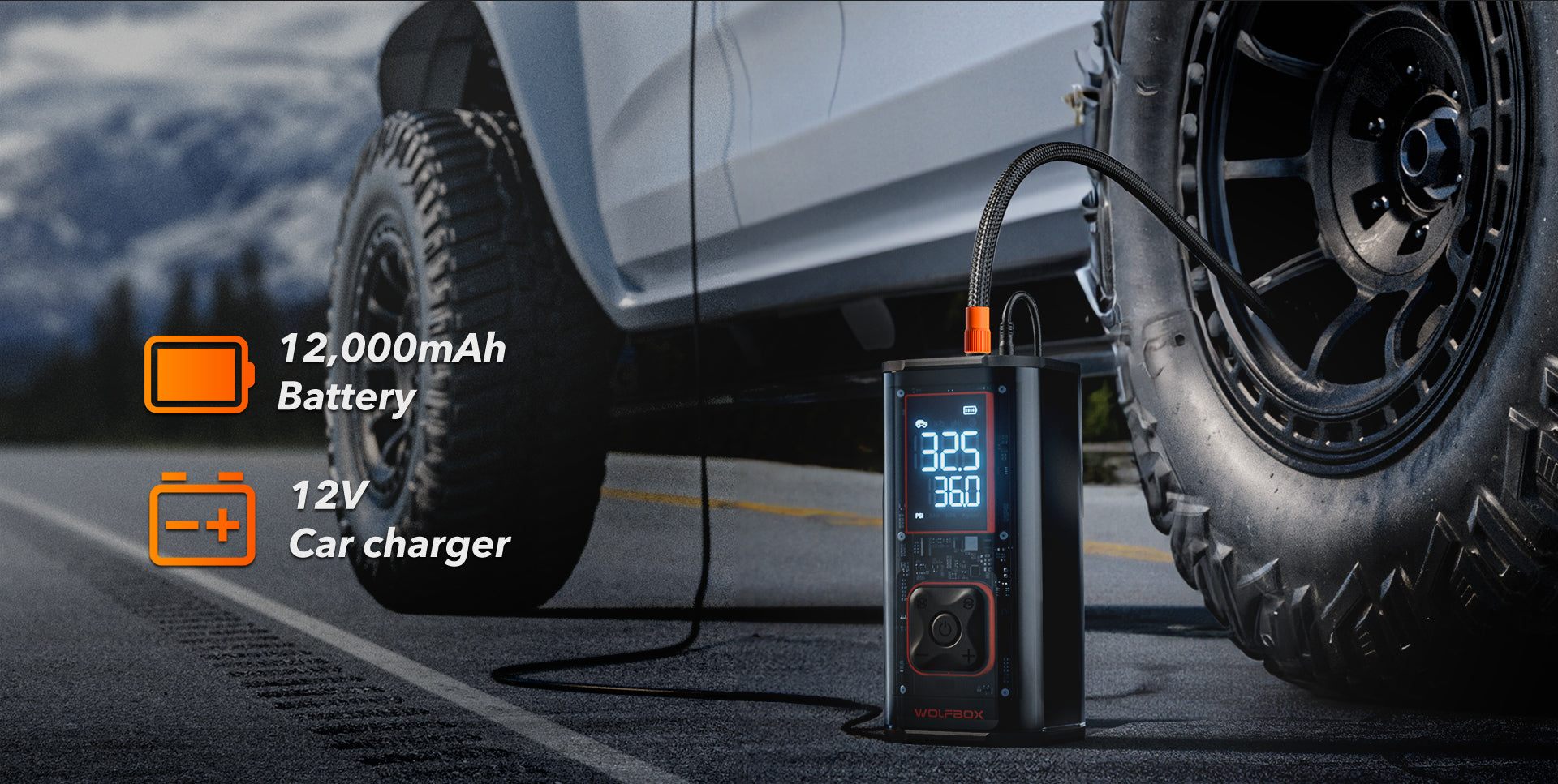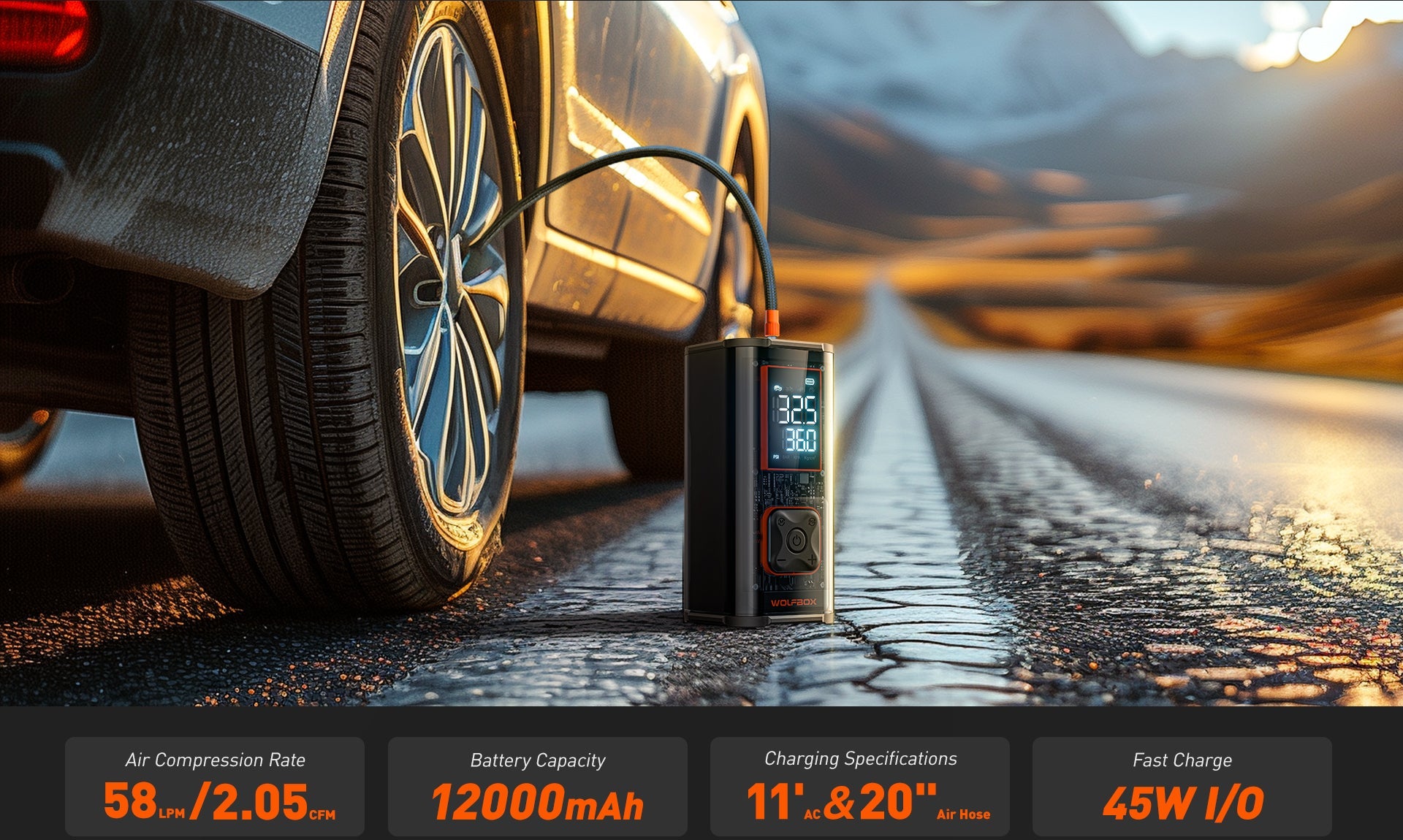 Experience Effortless Inflation with WOLFBOX MegaFlow 24 Pro Tyre Inflator - Featuring a 58LPM Air Flow and 12,000mAh Power for Maximum Convenience.