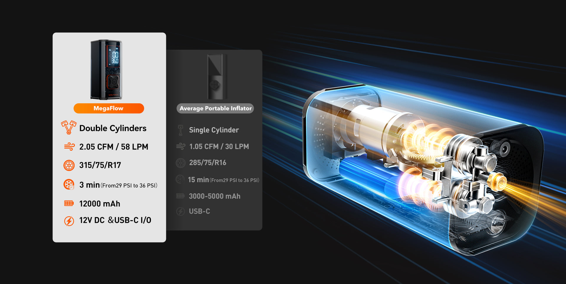 - 58LPM Air Flow for Big Tires Our air compressor delivers an impressive 58LPM air flow speed, making it perfect for inflating large tires on trucks, RVs, SUVs, and off-road vehicles. It also quickly inflates smaller vehicle tires.