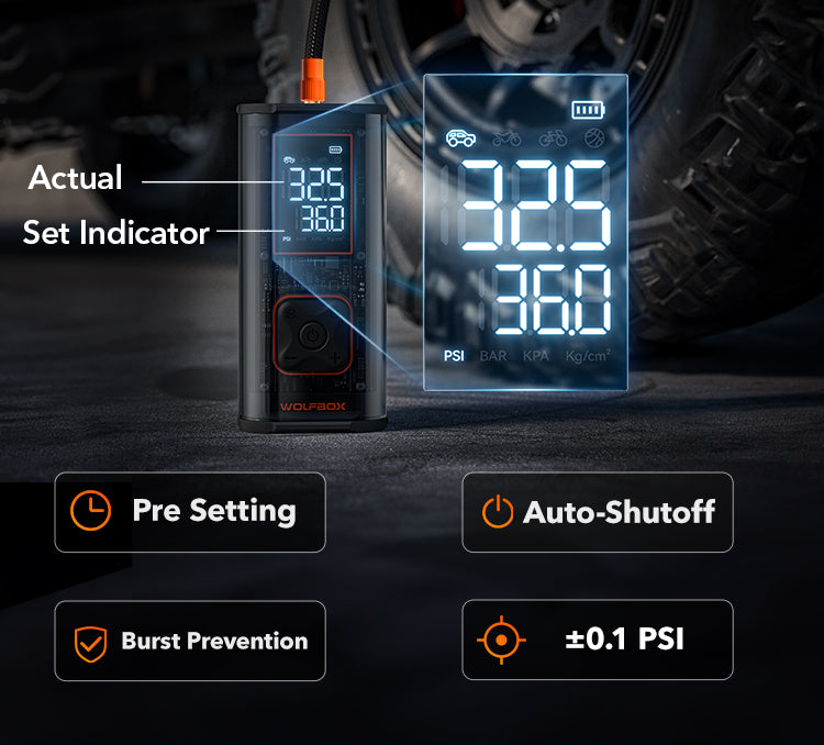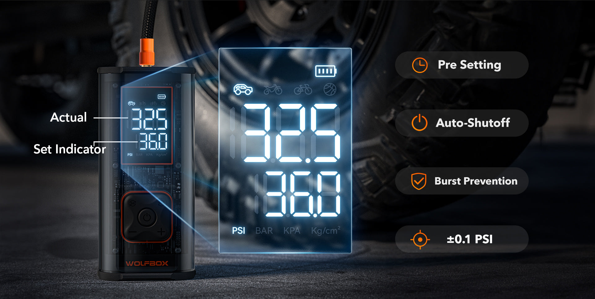 - Precise Pressure Gauge and Preset Options for Easy Use Monitor pressure levels precisely and preset your desired PSI for a seamless and hassle-free inflation experience.