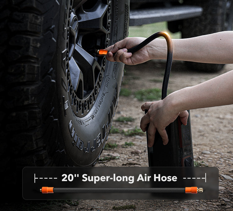- 11' Power Cord and 20" Air Hose for Unmatched Reach Whether using the 12V DC or built-in battery mode, the generous cord and hose lengths allow you to easily reach any tire, no matter the size of your vehicle.